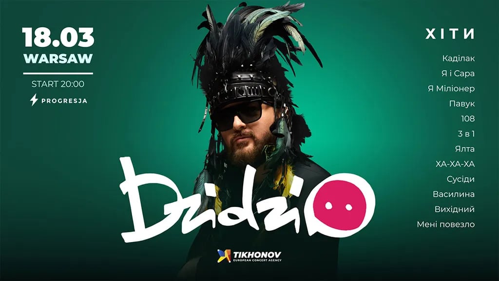 To wyjątkowa okazja, by usłyszeć na żywo wszystkie największe hity w wykonaniu Twojego ulubionego wokalisty! Koncerty DZIDZIO wypełnione są autentyczną ukraińską atmosferą: mnóstwem humoru i żartów, wysoką energią i najbardziej pozytywnymi wibracjami. Czeka na Ciebie niezapomniane wydarzenie, które zachwyci wszystkich uczestników.