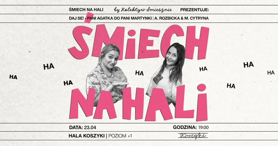 Śmiech na Hali to cykl komediowy Kolektywu Śmiesznie w Hali Koszyki. Dwa razy w miesiącu za Wasz dobry humor i samopoczucie odpowiadają stołeczni komicy i komiczki z Kolektywu Śmiesznie. Oprócz srogiej kurateli nad komediową sceną w Koszykach, członkowie i członkinie Kolektywu zajmują się improwizacją, stand-up’em, edukacją artystyczną, tworzeniem scenariuszy, muzyki i krótkich form internetowych. Bawią stołeczną publiczność od 2017 roku, współtworząc lokalne sceny komediowe, takie jak: Klub Komediowy i Resort Komedii.